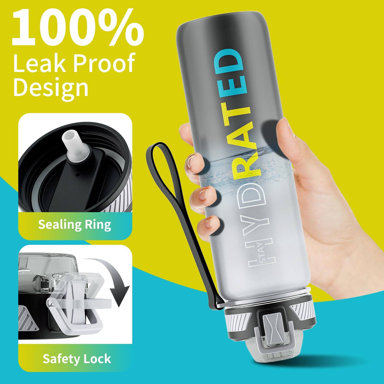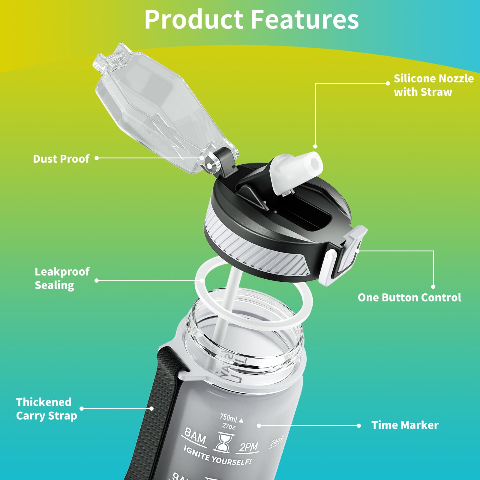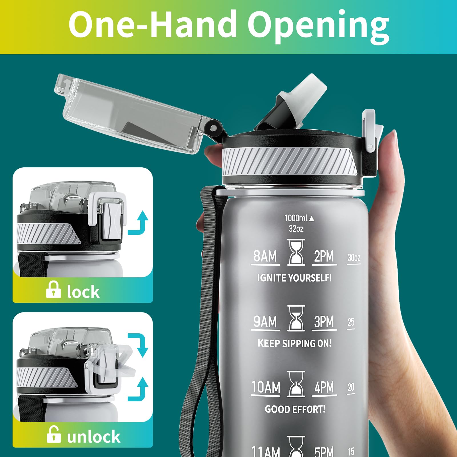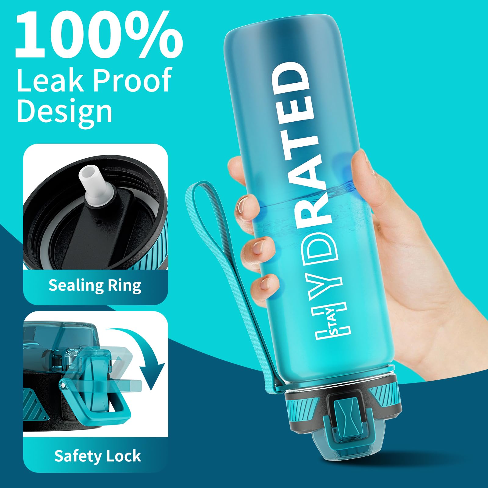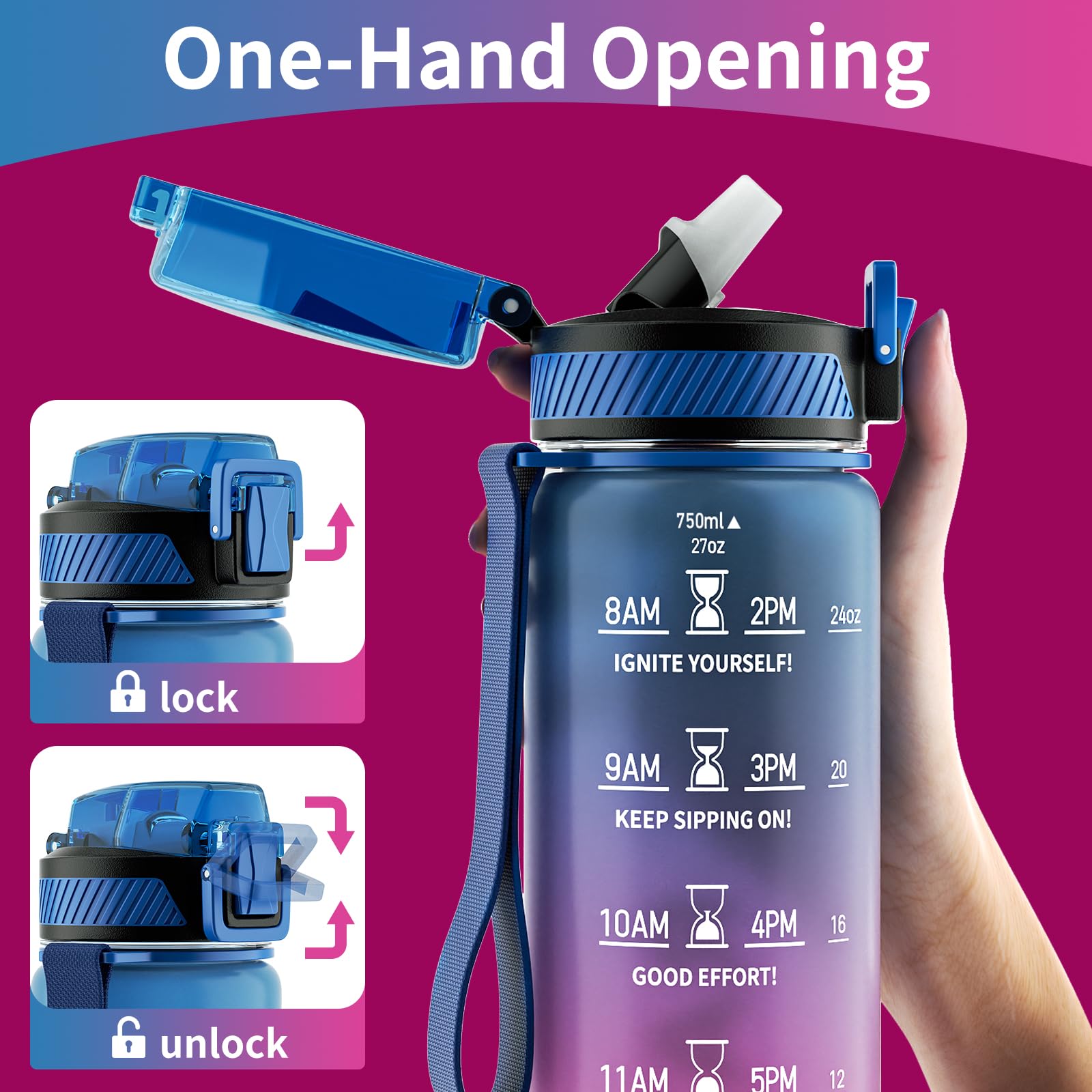 - Easily Open & Leakproof: Our motivational water bottles flip-top lid is designed with a secure lock, which effectively preventing dust and leak-proof. It can be easily opened with one hand. Our sports water bottles for school has a silicone nozzle with a straw inside to prevent turbulent water flow
